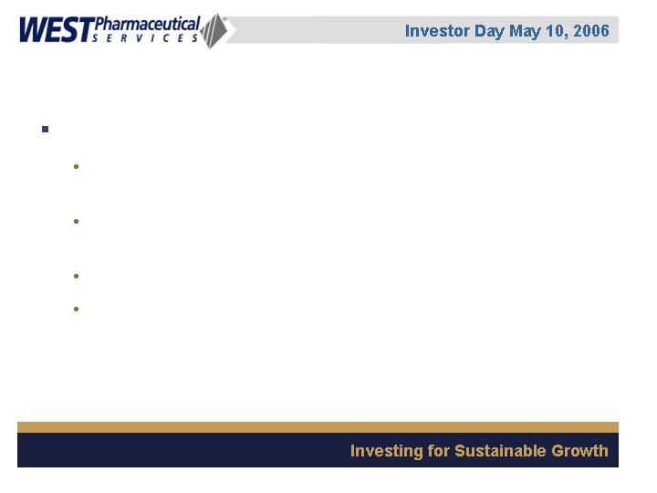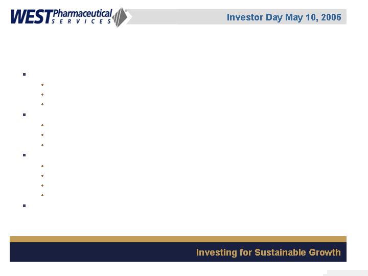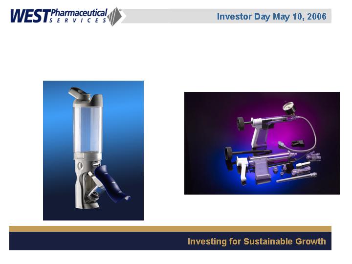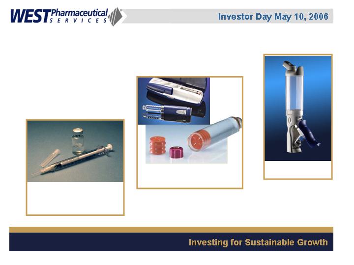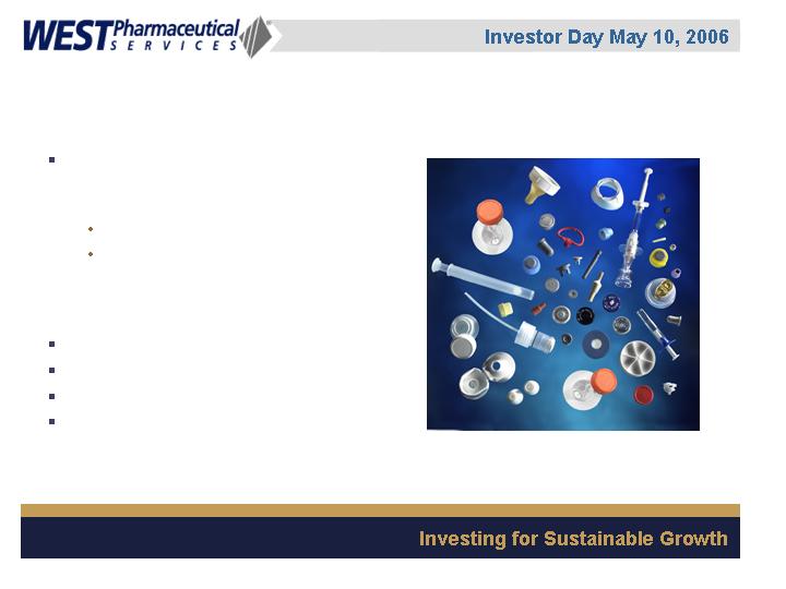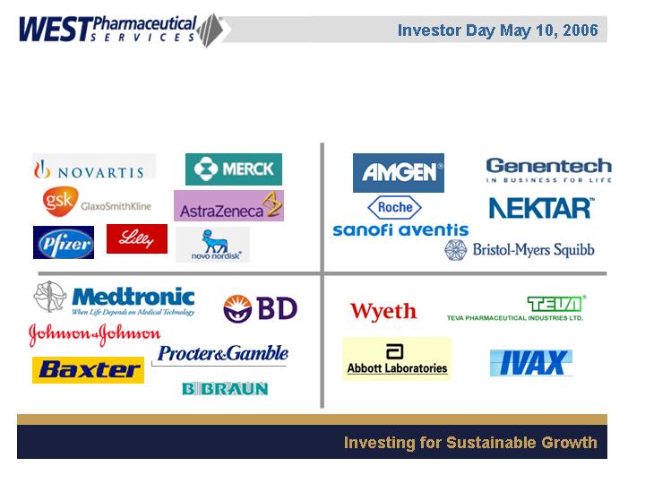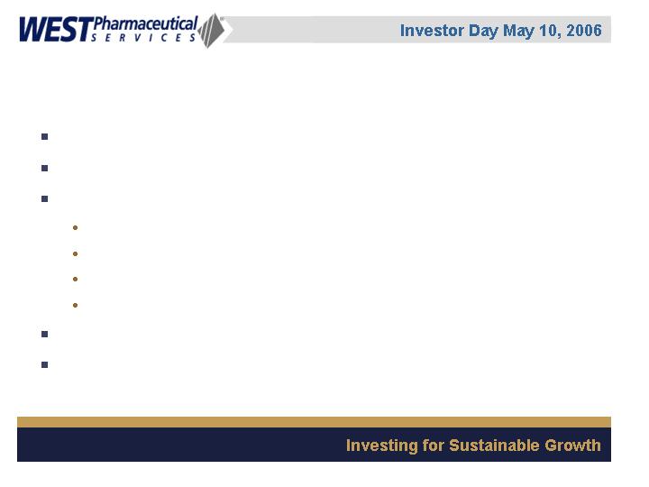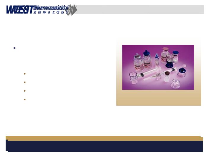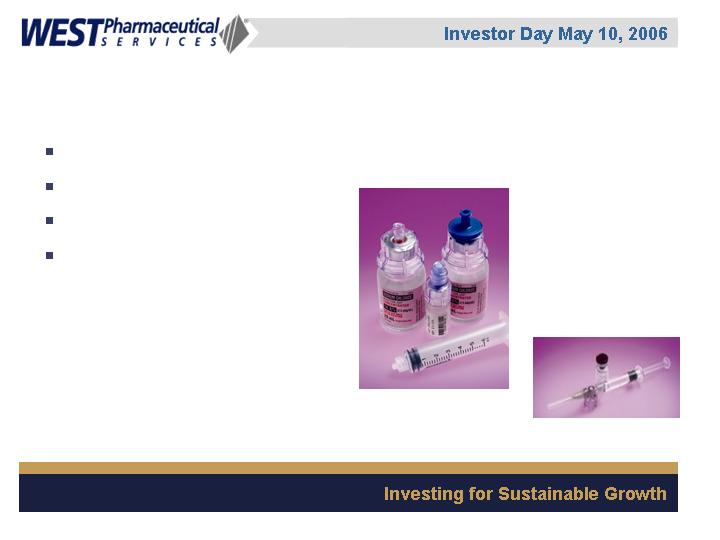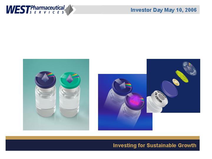 West Pharmaceutical Services, Inc. is the worlds premier manufacturer of components and systems for injectable drug delivery, including stoppers and seals for vials, and closures and disposable components used in syringe, IV and blood collection systems. The Company also provides products with application to the personal care, food and beverage markets. Wests customers include the worlds leading pharmaceutical, biotechnology, generic drug and medical device producers. Headquartered in Lionville, Pennsylvania, West Pharmaceutical Services supports its partners and customers from 50 locations throughout North America, South America, Europe, Mexico, Japan, Asia and Australia. For more information, visit West at http://www.westpharma.com.