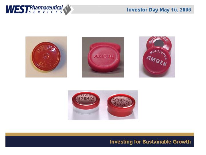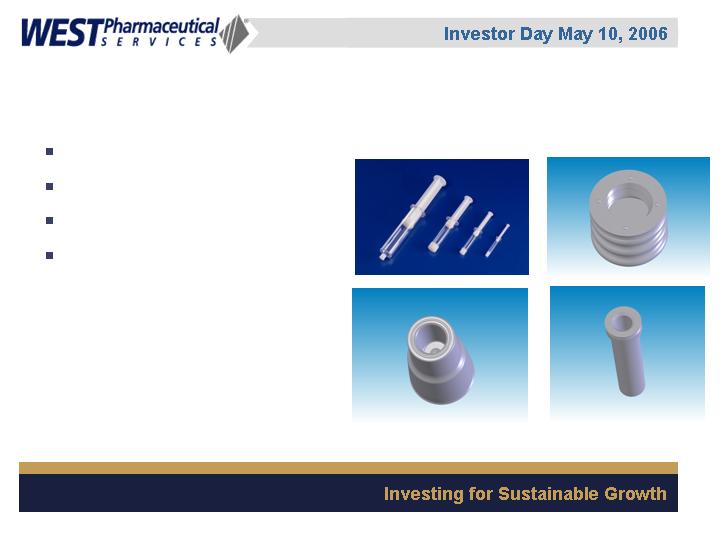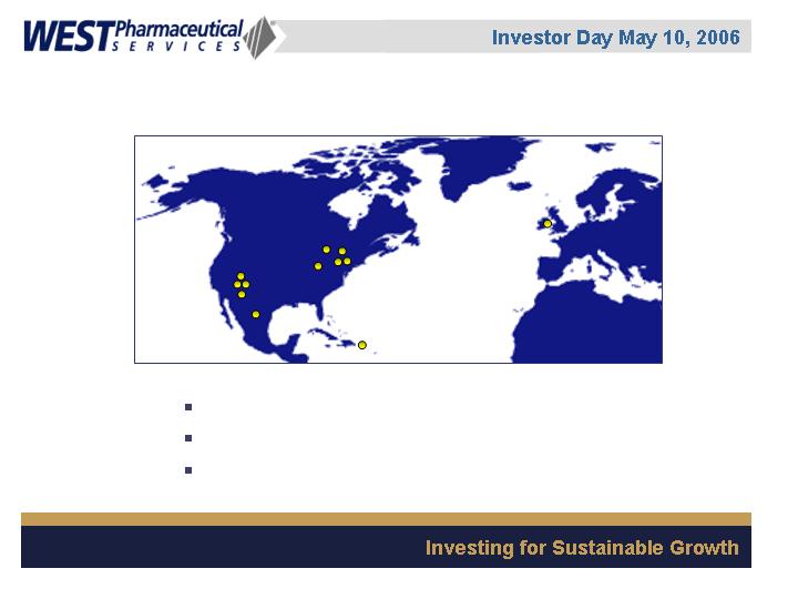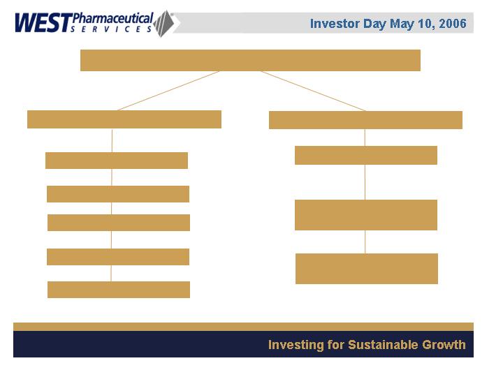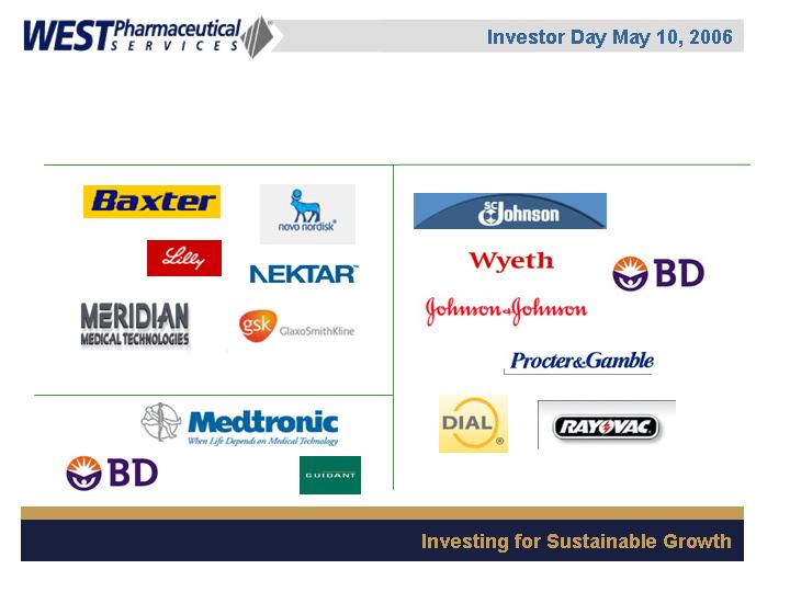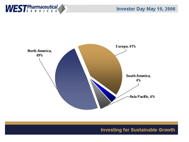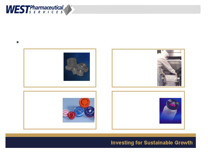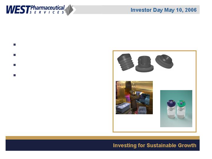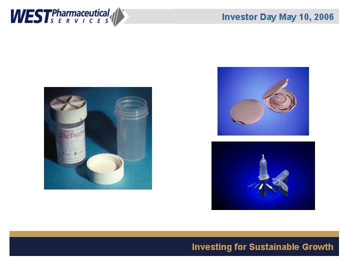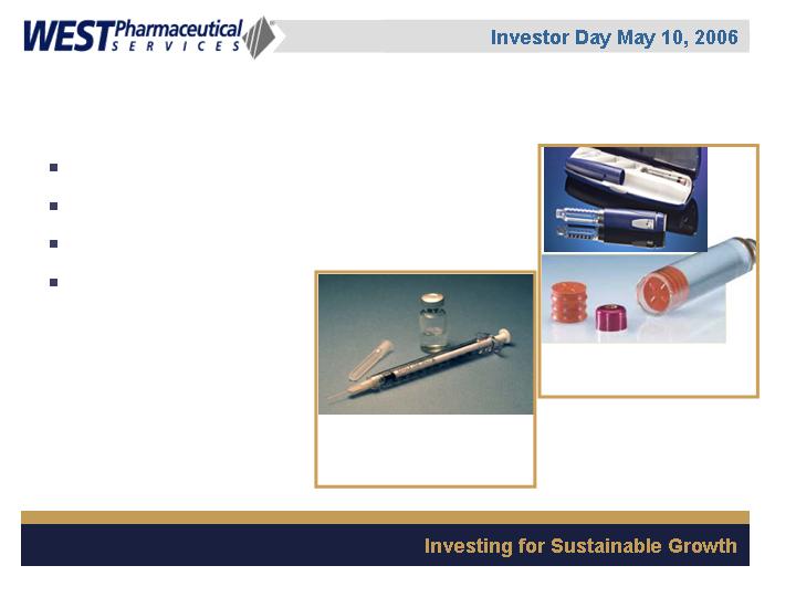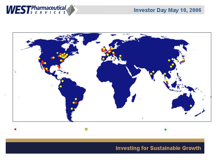 West Pharmaceutical Services, Inc. is the worlds premier manufacturer of components and systems for injectable drug delivery, including stoppers and seals for vials, and closures and disposable components used in syringe, IV and blood collection systems. The Company also provides products with application to the personal care, food and beverage markets. Wests customers include the worlds leading pharmaceutical, biotechnology, generic drug and medical device producers. Headquartered in Lionville, Pennsylvania, West Pharmaceutical Services supports its partners and customers from 50 locations throughout North America, South America, Europe, Mexico, Japan, Asia and Australia. For more information, visit West at http://www.westpharma.com.