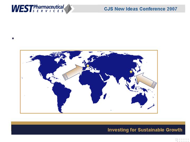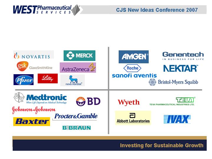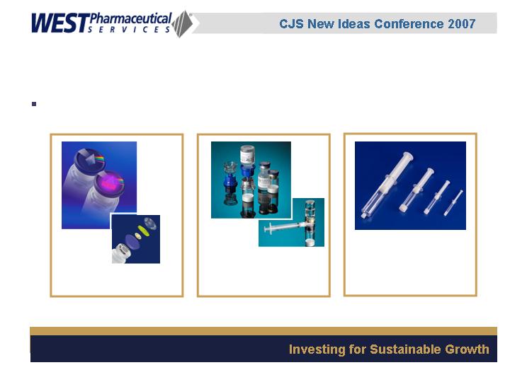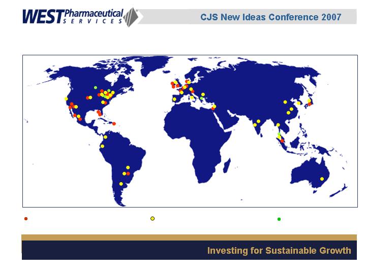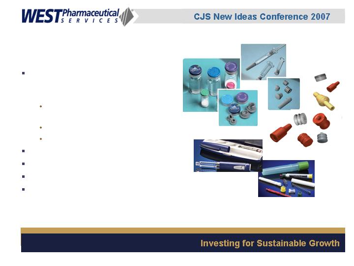 West Pharmaceutical Services, Inc. is the world's premier manufacturer of components and systems for injectable drug delivery, including stoppers and seals for vials, and closures and disposable components used in syringe, IV and blood collection systems. The Company also provides products with application to the personal care, food and beverage markets. West's customers include the world's leading pharmaceutical, biotechnology, generic drug and medical device producers. Headquartered in Lionville, Pennsylvania, West Pharmaceutical Services supports its partners and customers from 50 locations throughout North America, South America, Europe, Mexico, Japan, Asia and Australia. For more information, visit West at http://www.westpharma.com.
