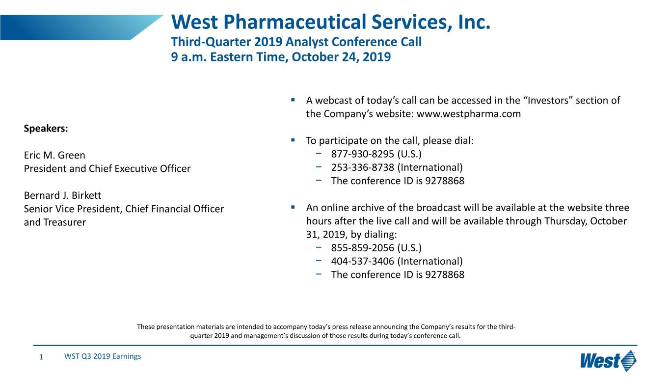 West Pharmaceutical Services, Inc. Third-Quarter 2019 Analyst Conference Call 9 a.m. Eastern Time, October 24, 2019 ▪ A webcast of today’s call can be accessed in the “Investors” section of the Company’s website: www.westpharma.com Speakers: ▪ To participate on the call, please dial: Eric M. Green − 877-930-8295 (U.S.) President and Chief Executive Officer − 253-336-8738 (International) − The conference ID is 9278868 Bernard J. Birkett Senior Vice President, Chief Financial Officer ▪ An online archive of the broadcast will be available at the website three and Treasurer hours after the live call and will be available through Thursday, October 31, 2019, by dialing: − 855-859-2056 (U.S.) − 404-537-3406 (International) − The conference ID is 9278868 These presentation materials are intended to accompany today’s press release announcing the Company’s results for the third- quarter 2019 and management’s discussion of those results during today’s conference call. 1 WST Q3 2019 Earnings