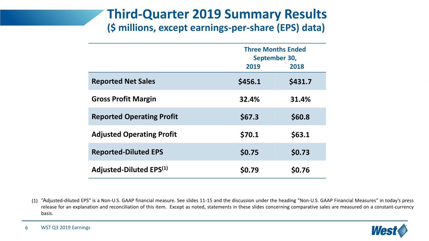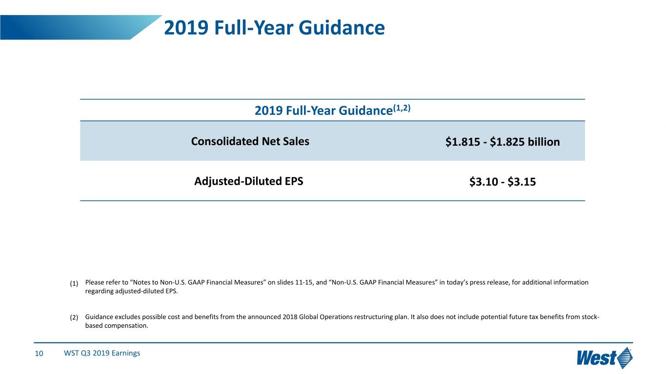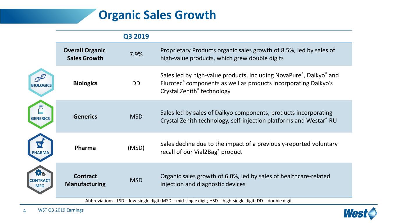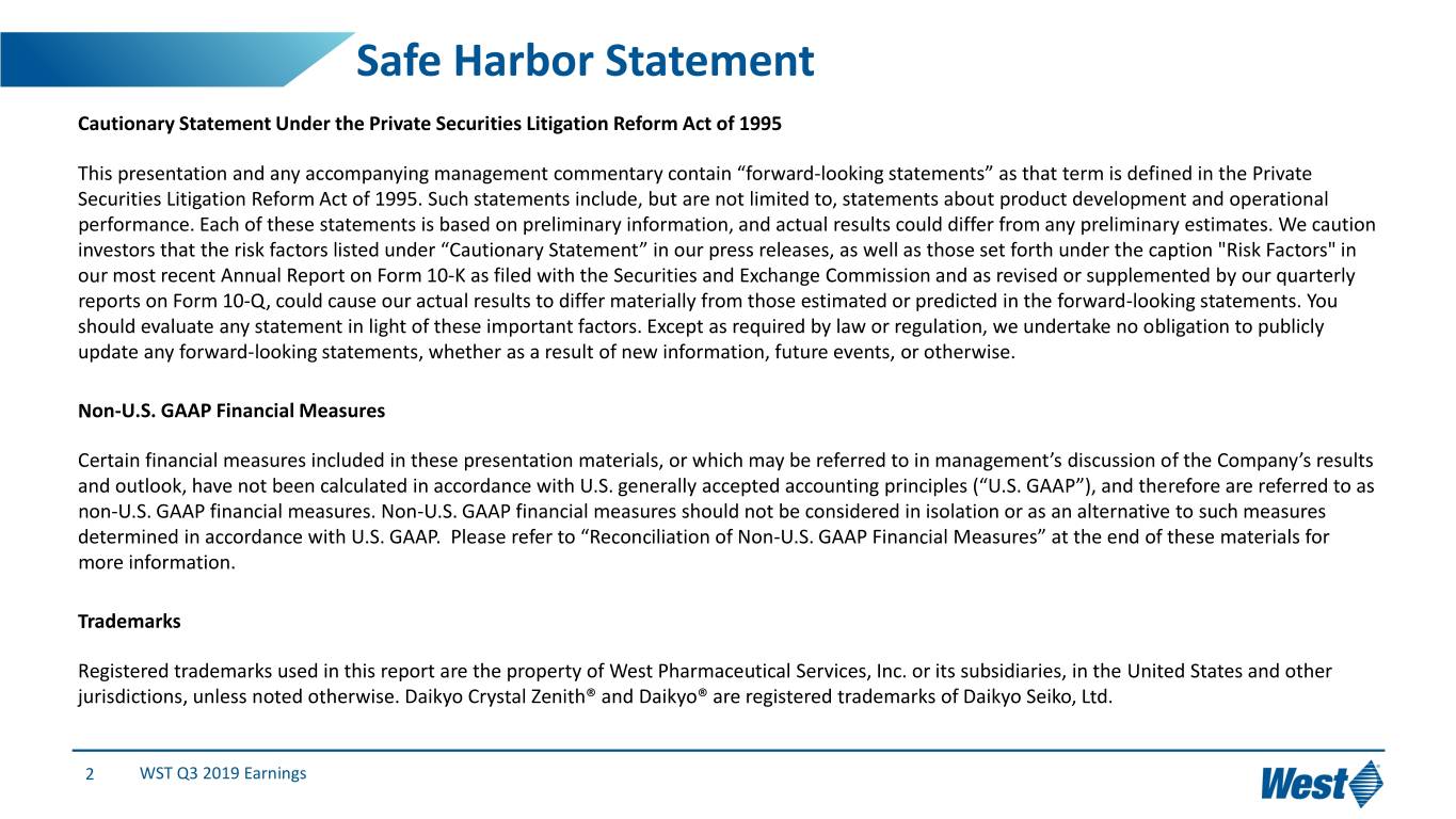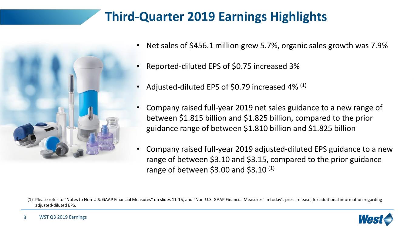 Safe Harbor Statement Cautionary Statement Under the Private Securities Litigation Reform Act of 1995 This presentation and any accompanying management commentary contain “forward-looking statements” as that term is defined in the Private Securities Litigation Reform Act of 1995. Such statements include, but are not limited to, statements about product development and operational performance. Each of these statements is based on preliminary information, and actual results could differ from any preliminary estimates. We caution investors that the risk factors listed under “Cautionary Statement” in our press releases, as well as those set forth under the caption "Risk Factors" in our most recent Annual Report on Form 10-K as filed with the Securities and Exchange Commission and as revised or supplemented by our quarterly reports on Form 10-Q, could cause our actual results to differ materially from those estimated or predicted in the forward-looking statements. You should evaluate any statement in light of these important factors. Except as required by law or regulation, we undertake no obligation to publicly update any forward-looking statements, whether as a result of new information, future events, or otherwise. Non-U.S. GAAP Financial Measures Certain financial measures included in these presentation materials, or which may be referred to in management’s discussion of the Company’s results and outlook, have not been calculated in accordance with U.S. generally accepted accounting principles (“U.S. GAAP”), and therefore are referred to as non-U.S. GAAP financial measures. Non-U.S. GAAP financial measures should not be considered in isolation or as an alternative to such measures determined in accordance with U.S. GAAP. Please refer to “Reconciliation of Non-U.S. GAAP Financial Measures” at the end of these materials for more information. Trademarks Registered trademarks used in this report are the property of West Pharmaceutical Services, Inc. or its subsidiaries, in the United States and other jurisdictions, unless noted otherwise. Daikyo Crystal Zenith® and Daikyo® are registered trademarks of Daikyo Seiko, Ltd. 2 WST Q3 2019 Earnings