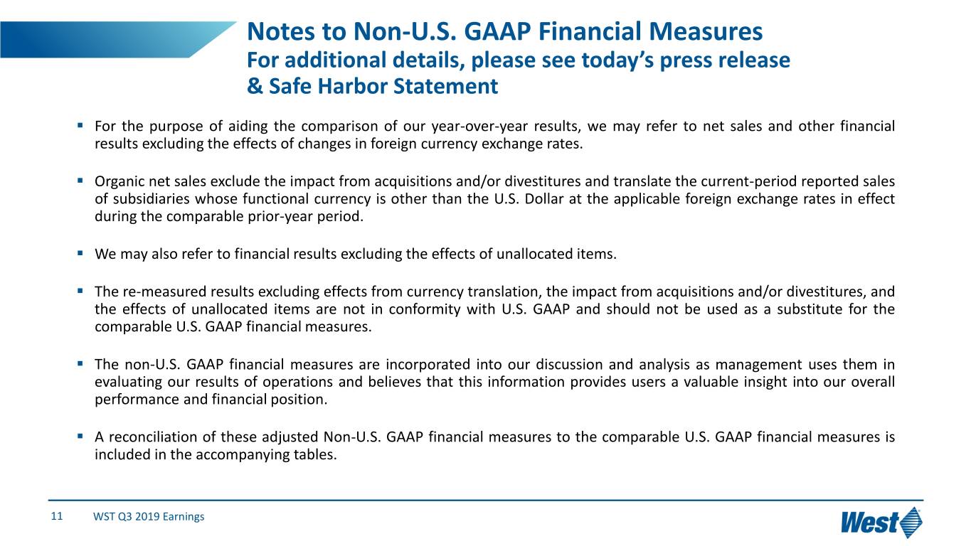 2019 Full-Year Guidance 2019 Full-Year Guidance(1,2) Consolidated Net Sales $1.815 - $1.825 billion Adjusted-Diluted EPS $3.10 - $3.15 (1) Please refer to “Notes to Non-U.S. GAAP Financial Measures” on slides 11-15, and “Non-U.S. GAAP Financial Measures” in today’s press release, for additional information regarding adjusted-diluted EPS. (2) Guidance excludes possible cost and benefits from the announced 2018 Global Operations restructuring plan. It also does not include potential future tax benefits from stock- based compensation. 10 WST Q3 2019 Earnings
