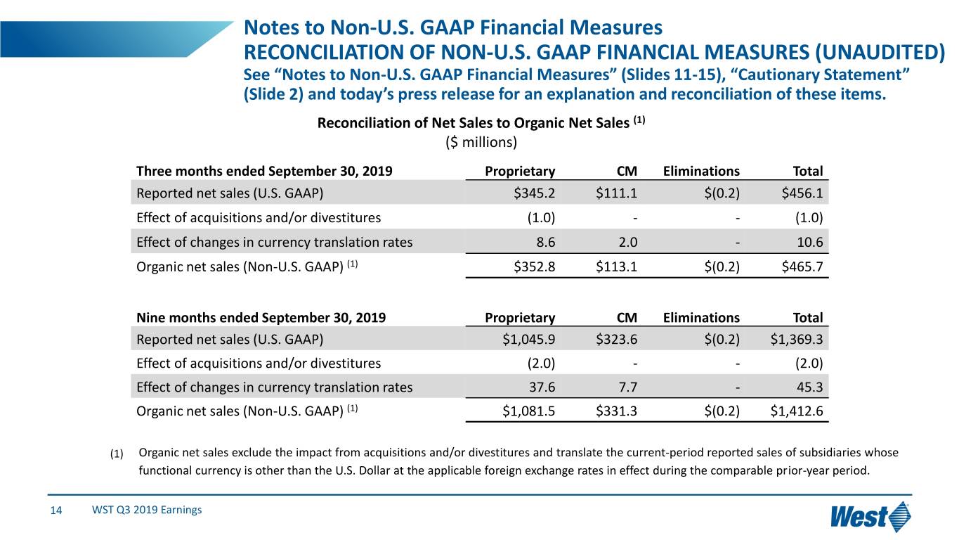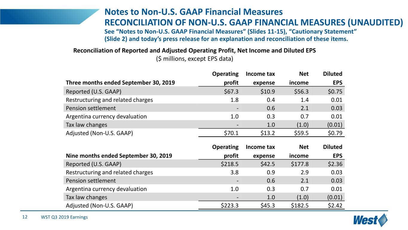 Notes to Non-U.S. GAAP Financial Measures RECONCILIATION OF NON-U.S. GAAP FINANCIAL MEASURES (UNAUDITED) See “Notes to Non-U.S. GAAP Financial Measures” (Slides 11-15), “Cautionary Statement” (Slide 2) and today’s press release for an explanation and reconciliation of these items. Reconciliation of Reported and Adjusted Operating Profit, Net Income and Diluted EPS ($ millions, except EPS data) Operating Income tax Net Diluted Three months ended September 30, 2018 profit expense income EPS Reported (U.S. GAAP) $60.8 $8.0 $55.2 $0.73 Restructuring and related charges 1.2 0.3 0.9 0.01 Argentina currency devaluation 1.1 - 1.1 0.02 Tax law changes - (0.4) 0.4 - Adjusted (Non-U.S. GAAP) $63.1 $7.9 $57.6 $0.76 Operating Income tax Net Diluted Nine months ended September 30, 2018 profit expense income EPS Reported (U.S. GAAP) $174.5 $26.5 $154.9 $2.05 Restructuring and related charges 6.7 1.5 5.2 0.07 Argentina currency devaluation 1.1 - 1.1 0.02 Tax law changes - 4.1 (4.1) (0.06) Adjusted (Non-U.S. GAAP) $182.3 $32.1 $157.1 $2.08 13 WST Q3 2019 Earnings