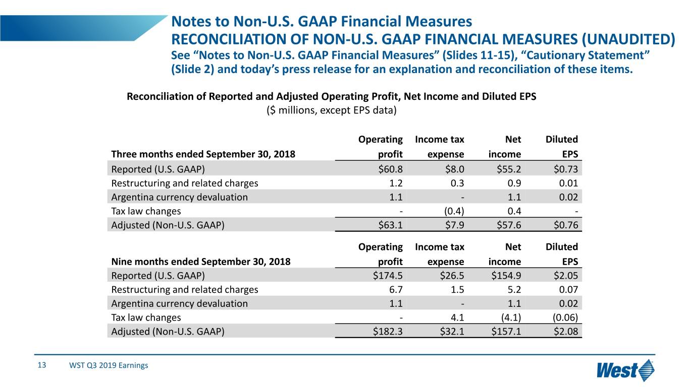 Notes to Non-U.S. GAAP Financial Measures RECONCILIATION OF NON-U.S. GAAP FINANCIAL MEASURES (UNAUDITED) See “Notes to Non-U.S. GAAP Financial Measures” (Slides 11-15), “Cautionary Statement” (Slide 2) and today’s press release for an explanation and reconciliation of these items. Reconciliation of Reported and Adjusted Operating Profit, Net Income and Diluted EPS ($ millions, except EPS data) Operating Income tax Net Diluted Three months ended September 30, 2019 profit expense income EPS Reported (U.S. GAAP) $67.3 $10.9 $56.3 $0.75 Restructuring and related charges 1.8 0.4 1.4 0.01 Pension settlement - 0.6 2.1 0.03 Argentina currency devaluation 1.0 0.3 0.7 0.01 Tax law changes - 1.0 (1.0) (0.01) Adjusted (Non-U.S. GAAP) $70.1 $13.2 $59.5 $0.79 Operating Income tax Net Diluted Nine months ended September 30, 2019 profit expense income EPS Reported (U.S. GAAP) $218.5 $42.5 $177.8 $2.36 Restructuring and related charges 3.8 0.9 2.9 0.03 Pension settlement - 0.6 2.1 0.03 Argentina currency devaluation 1.0 0.3 0.7 0.01 Tax law changes - 1.0 (1.0) (0.01) Adjusted (Non-U.S. GAAP) $223.3 $45.3 $182.5 $2.42 12 WST Q3 2019 Earnings