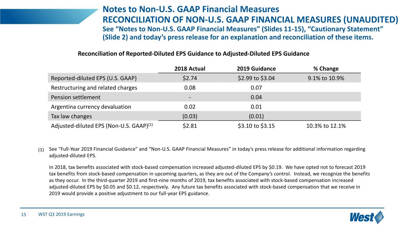 Notes to Non-U.S. GAAP Financial Measures RECONCILIATION OF NON-U.S. GAAP FINANCIAL MEASURES (UNAUDITED) See “Notes to Non-U.S. GAAP Financial Measures” (Slides 11-15), “Cautionary Statement” (Slide 2) and today’s press release for an explanation and reconciliation of these items. Reconciliation of Net Sales to Organic Net Sales (1) ($ millions) Three months ended September 30, 2019 Proprietary CM Eliminations Total Reported net sales (U.S. GAAP) $345.2 $111.1 $(0.2) $456.1 Effect of acquisitions and/or divestitures (1.0) - - (1.0) Effect of changes in currency translation rates 8.6 2.0 - 10.6 Organic net sales (Non-U.S. GAAP) (1) $352.8 $113.1 $(0.2) $465.7 Nine months ended September 30, 2019 Proprietary CM Eliminations Total Reported net sales (U.S. GAAP) $1,045.9 $323.6 $(0.2) $1,369.3 Effect of acquisitions and/or divestitures (2.0) - - (2.0) Effect of changes in currency translation rates 37.6 7.7 - 45.3 Organic net sales (Non-U.S. GAAP) (1) $1,081.5 $331.3 $(0.2) $1,412.6 (1) Organic net sales exclude the impact from acquisitions and/or divestitures and translate the current-period reported sales of subsidiaries whose functional currency is other than the U.S. Dollar at the applicable foreign exchange rates in effect during the comparable prior-year period. 14 WST Q3 2019 Earnings