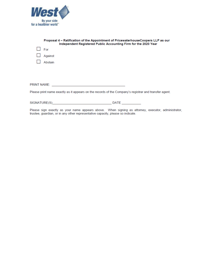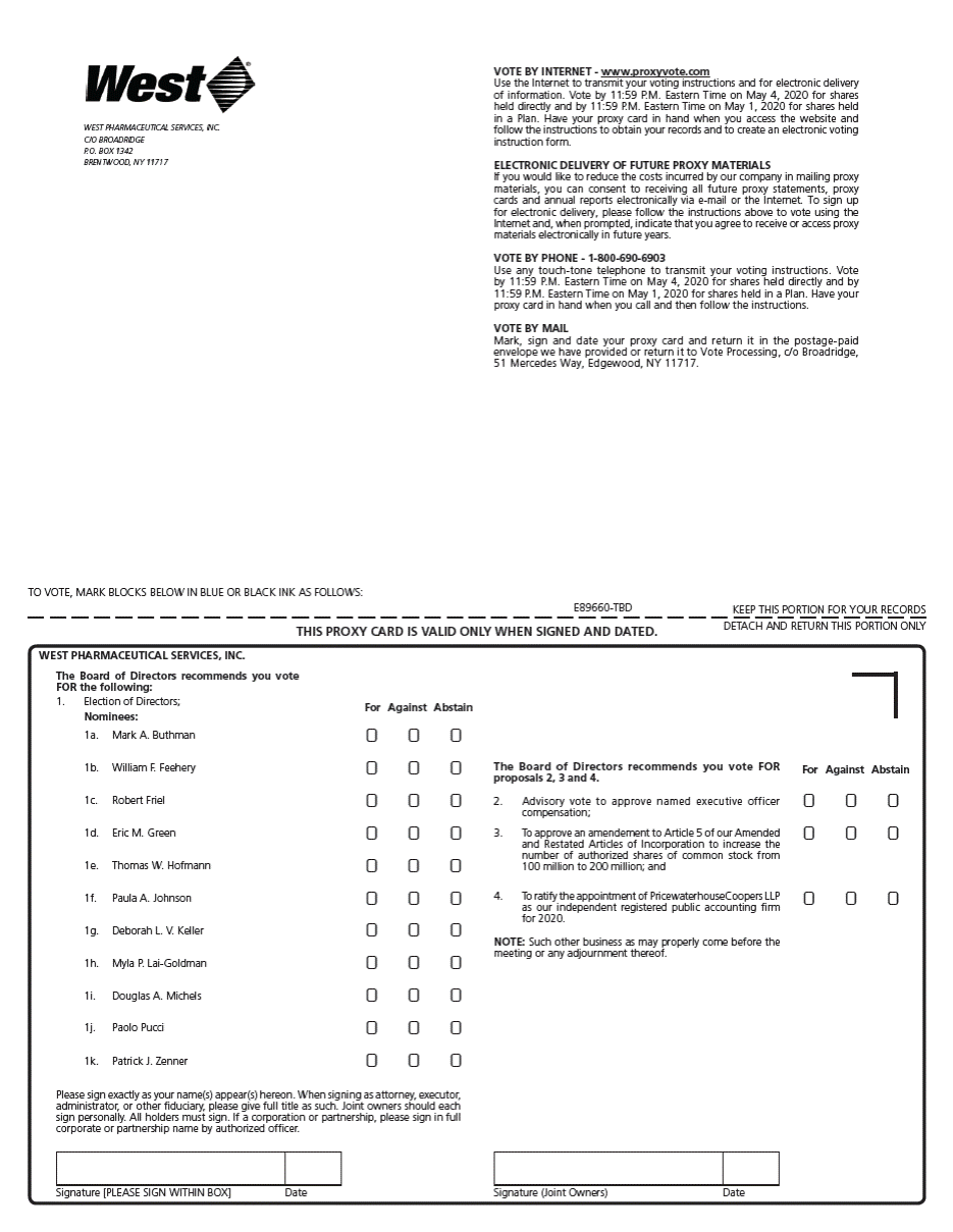 VOTE BY INTERNET - www.proxyvote.com Use the Internet to transmit your voting instructions and for electronic delivery of information. Vote by 11:59 P.M. Eastern Time on May 4, 2020 for shares held directly and by 11:59 P.M. Eastern Time on May 1, 2020 for shares held in a Plan. Have your proxy card in hand when you access the website and follow the instructions to obtain your records and to create an electronic voting instruction form. WEST PHARMACEUTICAL SERVICES, INC. C/O BROADRIDGE P.O. BOX 1342 BRENTWOOD, NY 11717 ELECTRONIC DELIVERY OF FUTURE PROXY MATERIALS If you would like to reduce the costs incurred by our company in mailing proxy materials, you can consent to receiving all future proxy statements, proxy cards and annual reports electronically via e-mail or the Internet. To sign up for electronic delivery, please follow the instructions above to vote using the Internet and, when prompted, indicate that you agree to receive or access proxy materials electronically in future years. VOTE BY PHONE - 1-800-690-6903 Use any touch-tone telephone to transmit your voting instructions. Vote by 11:59 P.M. Eastern Time on May 4, 2020 for shares held directly and by 11:59 P.M. Eastern Time on May 1, 2020 for shares held in a Plan. Have your proxy card in hand when you call and then follow the instructions. VOTE BY MAIL Mark, sign and date your proxy card and return it in the postage-paid envelope we have provided or return it to Vote Processing, c/o Broadridge, 51 Mercedes Way, Edgewood, NY 11717. TO VOTE, MARK BLOCKS BELOW IN BLUE OR BLACK INK AS FOLLOWS: E89660-TBD KEEP THIS PORTION FOR YOUR RECORDS DETACH AND RETURN THIS PORTION ONLY THIS PROXY CARD IS VALID ONLY WHEN SIGNED AND DATED. WEST PHARMACEUTICAL SERVICES, INC. The Board of Directors recommends you vote FOR the following: 1. Election of Directors; Nominees: For Against Abstain ! ! ! ! ! ! ! ! ! ! ! ! ! ! ! ! ! ! ! ! ! ! ! ! ! ! ! ! ! ! ! ! ! 1a. Mark A. Buthman The Board of Directors recommends you vote FOR proposals 2, 3 and 4. 1b. William F. Feehery For Against Abstain ! ! ! ! ! ! 1c. Robert Friel 2. Advisory vote to approve named executive officer compensation; To approve an amendement to Article 5 of our Amended and Restated Articles of Incorporation to increase the number of authorized shares of common stock from 100 million to 200 million; and 1d. Eric M. Green 3. 1e. Thomas W. Hofmann ! ! ! 4. To ratify the appointment of PricewaterhouseCoopers LLP as our independent registered public accounting firm for 2020. 1f. Paula A. Johnson 1g. Deborah L. V. Keller NOTE: Such other business as may properly come before the meeting or any adjournment thereof. 1h. Myla P. Lai-Goldman 1i. Douglas A. Michels 1j. Paolo Pucci 1k. Patrick J. Zenner Please sign exactly as your name(s) appear(s) hereon. When signing as attorney, executor, administrator, or other fiduciary, please give full title as such. Joint owners should each sign personally. All holders must sign. If a corporation or partnership, please sign in full corporate or partnership name by authorized officer. Signature [PLEASE SIGN WITHIN BOX] Date Signature (Joint Owners) Date