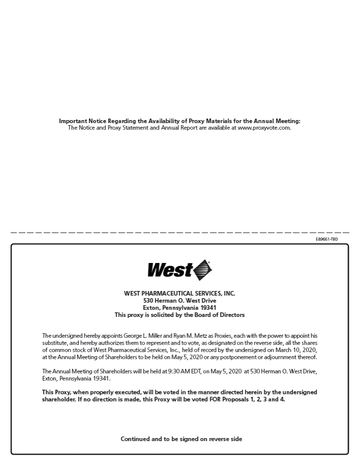 Important Notice Regarding the Availability of Proxy Materials for the Annual Meeting: The Notice and Proxy Statement and Annual Report are available at www.proxyvote.com. E89661-TBD WEST PHARMACEUTICAL SERVICES, INC. 530 Herman O. West Drive Exton, Pennsylvania 19341 This proxy is solicited by the Board of Directors The undersigned hereby appoints George L. Miller and Ryan M. Metz as Proxies, each with the power to appoint his substitute, and hereby authorizes them to represent and to vote, as designated on the reverse side, all the shares of common stock of West Pharmaceutical Services, Inc., held of record by the undersigned on March 10, 2020, at the Annual Meeting of Shareholders to be held on May 5, 2020 or any postponement or adjournment thereof. The Annual Meeting of Shareholders will be held at 9:30 AM EDT, on May 5, 2020 at 530 Herman O. West Drive, Exton, Pennsylvania 19341. This Proxy, when properly executed, will be voted in the manner directed herein by the undersigned shareholder. If no direction is made, this Proxy will be voted FOR Proposals 1, 2, 3 and 4. Continued and to be signed on reverse side