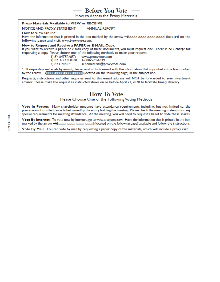 Before You Vote How to Access the Proxy Materials How To Vote Please Choose One of the Following Voting Methods E89664-[TBD] Vote In Person: Many shareholder meetings have attendance requirements including, but not limited to, the possession of an attendance ticket issued by the entity holding the meeting. Please check the meeting materials for any special requirements for meeting attendance. At the meeting, you will need to request a ballot to vote these shares. Vote By Internet: To vote now by Internet, go to www.proxyvote.com. Have the information that is printed in the box marked by the arrow (located on the following page) available and follow the instructions. Vote By Mail: You can vote by mail by requesting a paper copy of the materials, which will include a proxy card. XXXX XXXX XXXX XXXX Proxy Materials Available to VIEW or RECEIVE: NOTICE AND PROXY STATEMENTANNUAL REPORT How to View Online: Have the information that is printed in the box marked by the arrow(located on the following page) and visit: www.proxyvote .com. How to Request and Receive a PAPER or E-MAIL Copy: If you want to receive a paper or e-mail copy of these documents, you must request one. There is NO charge for requesting a copy. Please choose one of the following methods to make your request: 1) BY INTERNET:www.proxyvote.com 2) BY TELEPHONE: 1-800-579-1639 3) BY E-MAIL*:sendmaterial@proxyvote.com * If requesting materials by e-mail, please send a blank e-mail with the information that is printed in the box marked by the arrow(located on the following page) in the subject line. Requests, instructions and other inquiries sent to this e-mail address will NOT be forwarded to your investment advisor. Please make the request as instructed above on or before April 21, 2020 to facilitate timely delivery. XXXX XXXX XXXX XXXX XXXX XXXX XXXX XXXX