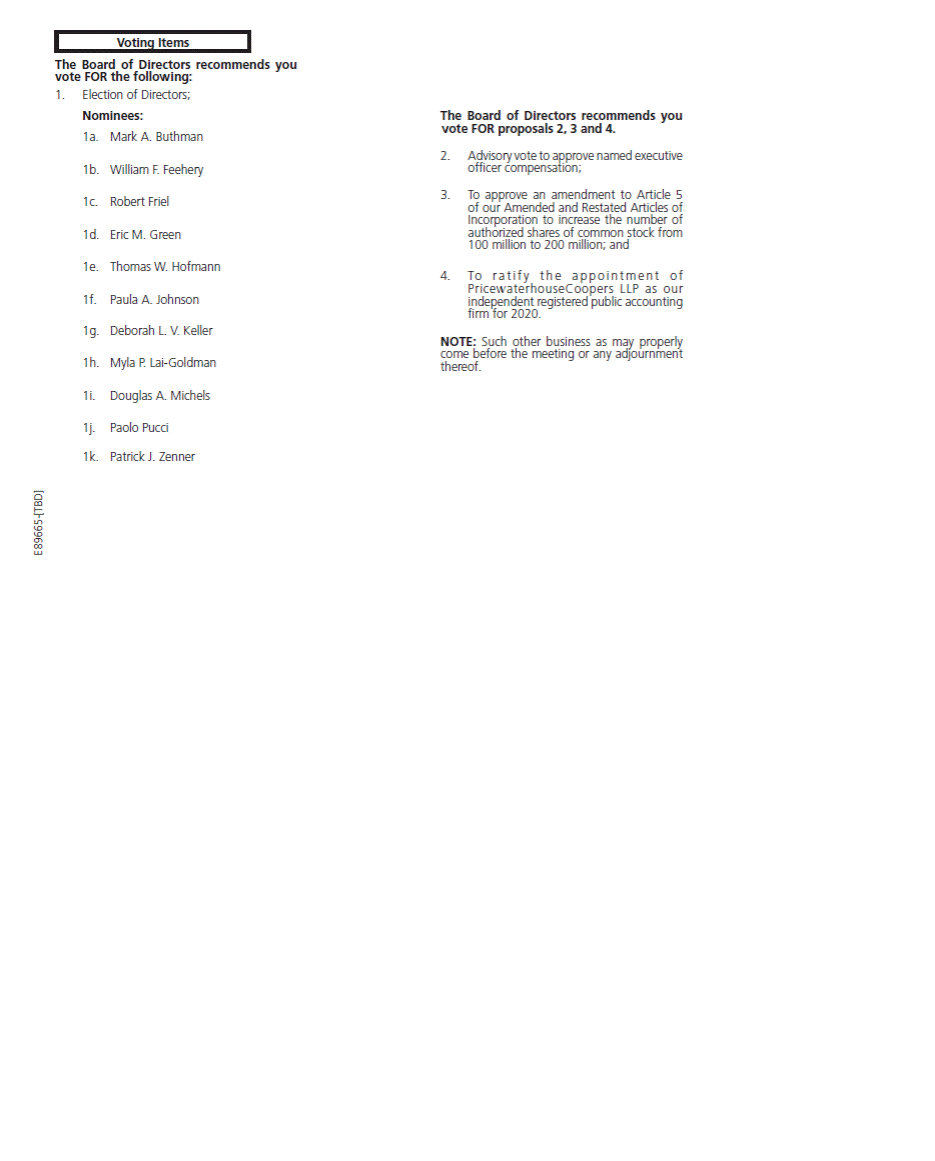 The Board of Directors recommends you vote FOR the following: 1.Election of Directors; Nominees: The Board of Directors recommends you vote FOR proposals 2, 3 and 4. 1a. Mark A. Buthman 2. Advisory vote to approve named executive officer compensation; 1b. William F. Feehery 3. To approve an amendment to Article 5 of our Amended and Restated Articles of Incorporation to increase the number of authorized shares of common stock from 100 million to 200 million; and 1c. Robert Friel 1d. Eric M. Green 1e. Thomas W. Hofmann 4. To ra ti fy th e ap p oi nt me nt of PricewaterhouseCoopers LLP as our independent registered public accounting firm for 2020. 1f. Paula A. Johnson 1g. Deborah L. V. Keller NOTE: Such other business as may properly come before the meeting or any adjournment thereof. 1h. Myla P. Lai-Goldman 1i. Douglas A. Michels 1j. Paolo Pucci 1k. Patrick J. Zenner E89665-[TBD] Voting Items