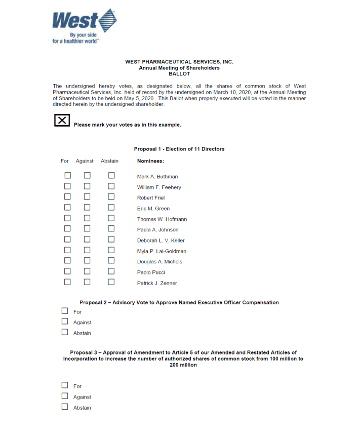 WEST PHARMACEUTICAL SERVICES, INC. Annual Meeting of Shareholders BALLOT The undersigned hereby votes, as designated below, all the shares of common stock of West Pharmaceutical Services, Inc. held of record by the undersigned on March 10, 2020, at the Annual Meeting of Shareholders to be held on May 5, 2020. This Ballot when properly executed will be voted in the manner directed herein by the undersigned shareholder. Please mark your votes as in this example. Proposal 1 - Election of 11 Directors For Against Abstain Nominees: Mark A. Buthman William F. Feehery Robert Friel Eric M. Green Thomas W. Hofmann Paula A. Johnson Deborah L. V. Keller Myla P. Lai-Goldman Douglas A. Michels Paolo Pucci Patrick J. Zenner Proposal 2 Advisory Vote to Approve Named Executive Officer Compensation For Against Abstain Proposal 3 Approval of Amendment to Article 5 of our Amended and Restated Articles of Incorporation to increase the number of authorized shares of common stock from 100 million to 200 million For Against Abstain